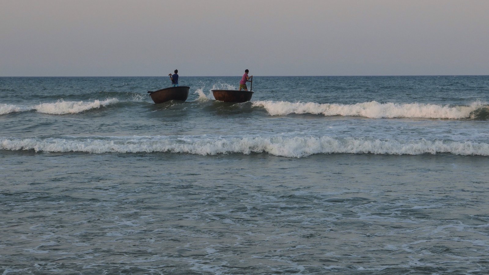 Vastu õhtut on meri täitunud vokkpannidega. Oleme Indias Hampis ise sellisega üle jõe sõitnud ja ausalt öeldes tunduvad need tüübid siin laine kõrgust arvestades pisut suitsiidsed olevat. Eks merekaru Ahto võtab lõpuks kanuu ja päästab nad ära, aga siiski — milleks asjata riskida.