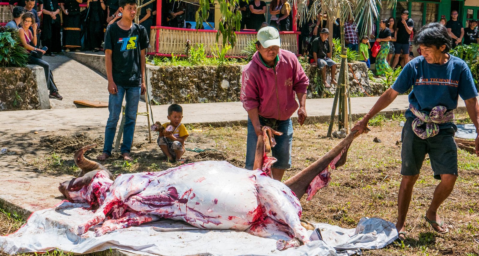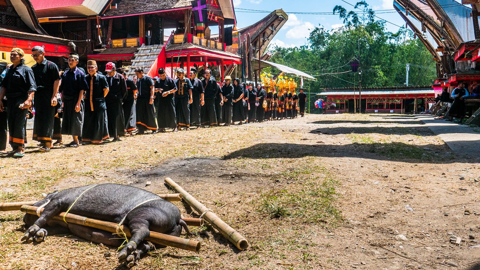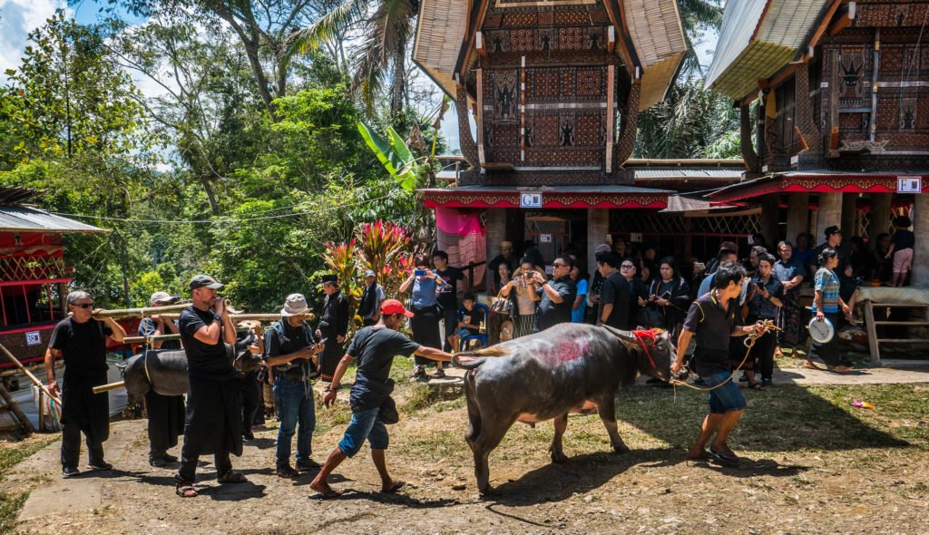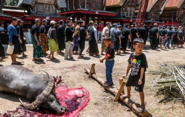 Pärast hilist ärkamist Rantepao linnakese öömajas jõuame välja minnes vaid kümne meetri kaugusele, kui satume rollerirendi hindu uurides mehe otsa, kes osutub giidiks. Tund hiljem leiame end juba matustelt. Nii algab meie tutvus Toraja ebatavalise kultuuriga, mida järgnevalt illustreerin kohati ka üsna avameelsete fotodega – praegu on ehk viimane hetk valida siiski telekas ja võileivad? Samas võin kinnitada, et neil piltidel pole midagi, mida Torajas ei näeks pidevalt isegi väikelapsed.