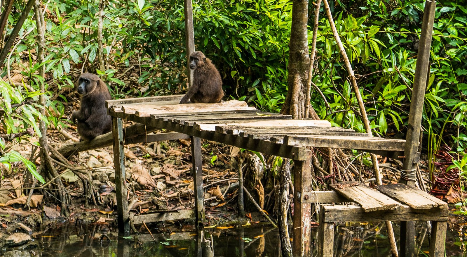 Ühel sillal, kust tahame üle minna, põrkame ootamatu takistuse otsa. Ahvid. Mitte mõni, vaid terve kari, kokku umbes 15–20 puude all piki mäeserva ringi lippamas. Esimesed metsloomad, keda me Indoneesias kohtame.