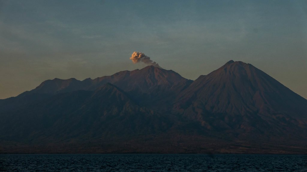 Seilame edasi päikeseloojangu poole. Meile pakub vaatemängu vulkaan, mis regulaarselt tuhka välja köhib.